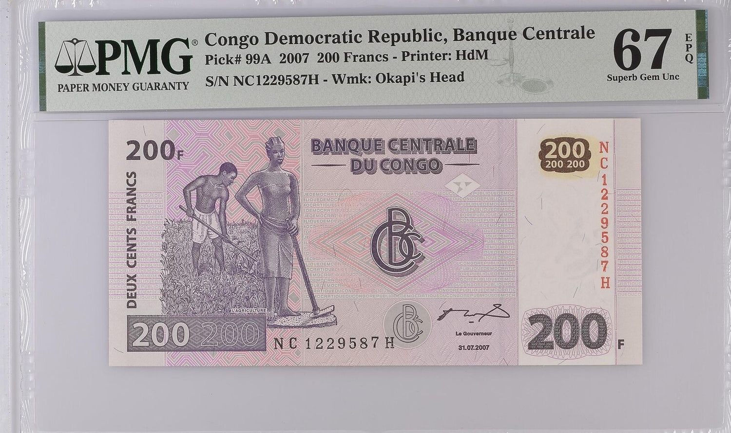 Congo 200 Francs 2007 P 99A HDM Superb Gem UNC PMG 67 EPQ Top Pop