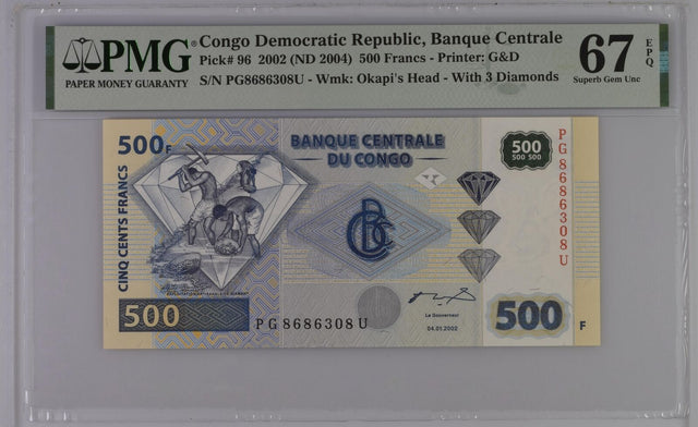 Congo 500 Francs 2002 ND 2004 P 96 Superb Gem UNC PMG 67 EPQ