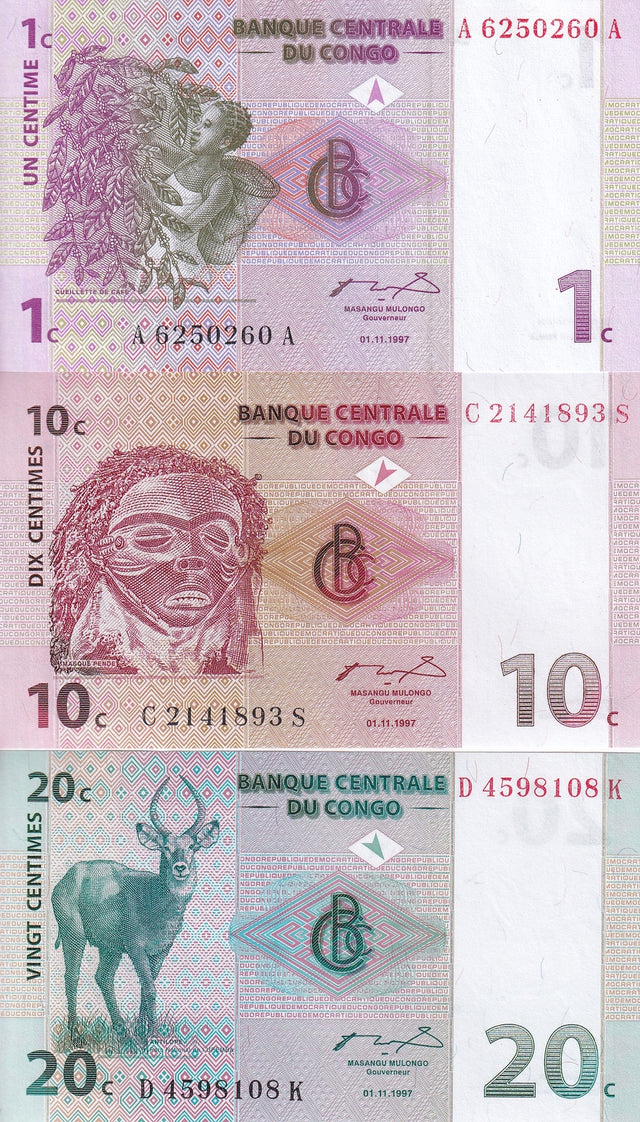 Congo Set 3 PCS 1 10 20 Centimes 1997 P 80 82 83 UNC