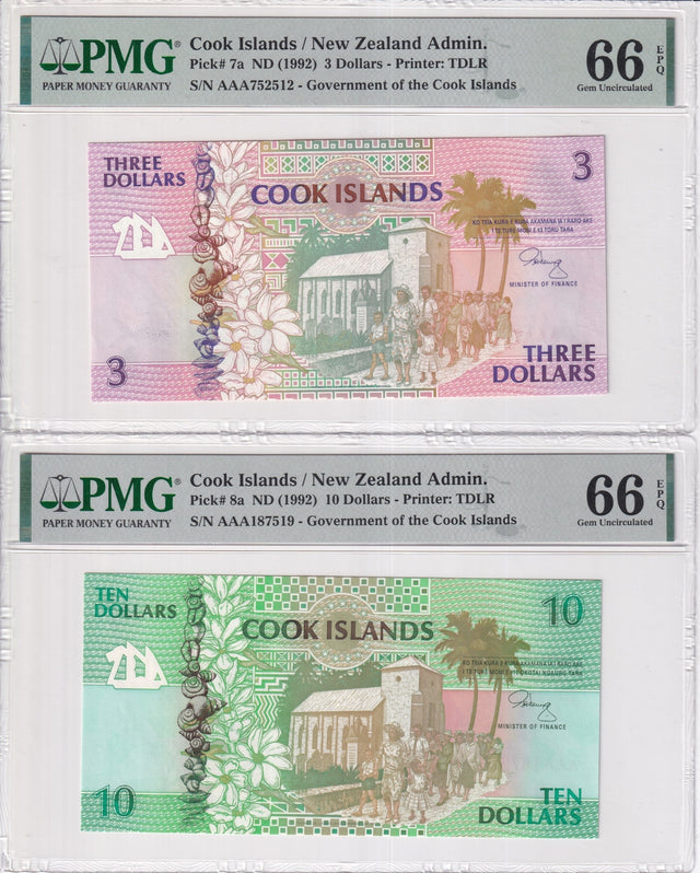 Cook Islands Set 2; 3 10 Dollars 1992 P 7 a P 8 a Gem UNC PMG 66 EPQ