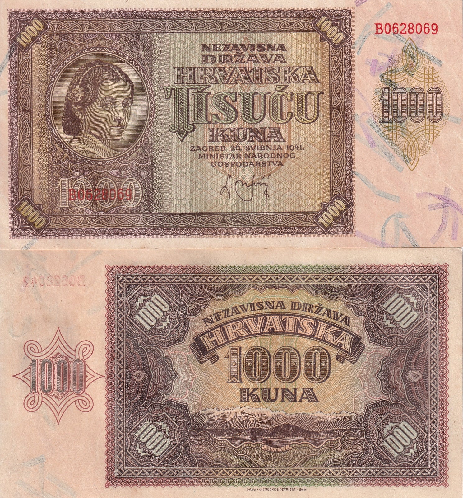Croatia 1000 Kuna 1941 P 4 a AU-UNC
