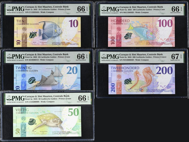 Curacao Set 5; 10 20 50 100 200 Gulden 2025 P 1 2-5 Superb Gem UNC PMG 66 67 EPQ