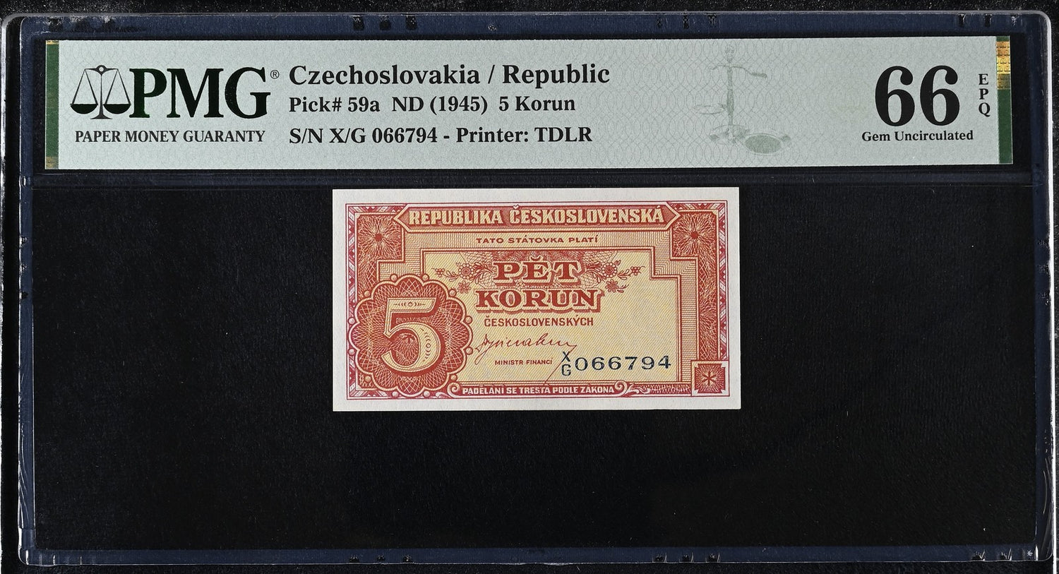 Czechoslovakia 5 Korun ND 1945 P 59 a Gem UNC PMG 66 EPQ