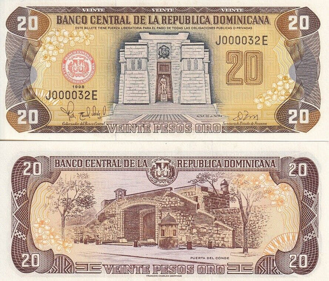 Dominican Republic 20 Pesos 1998 Low serial # 2 Digit P 154 b UNC