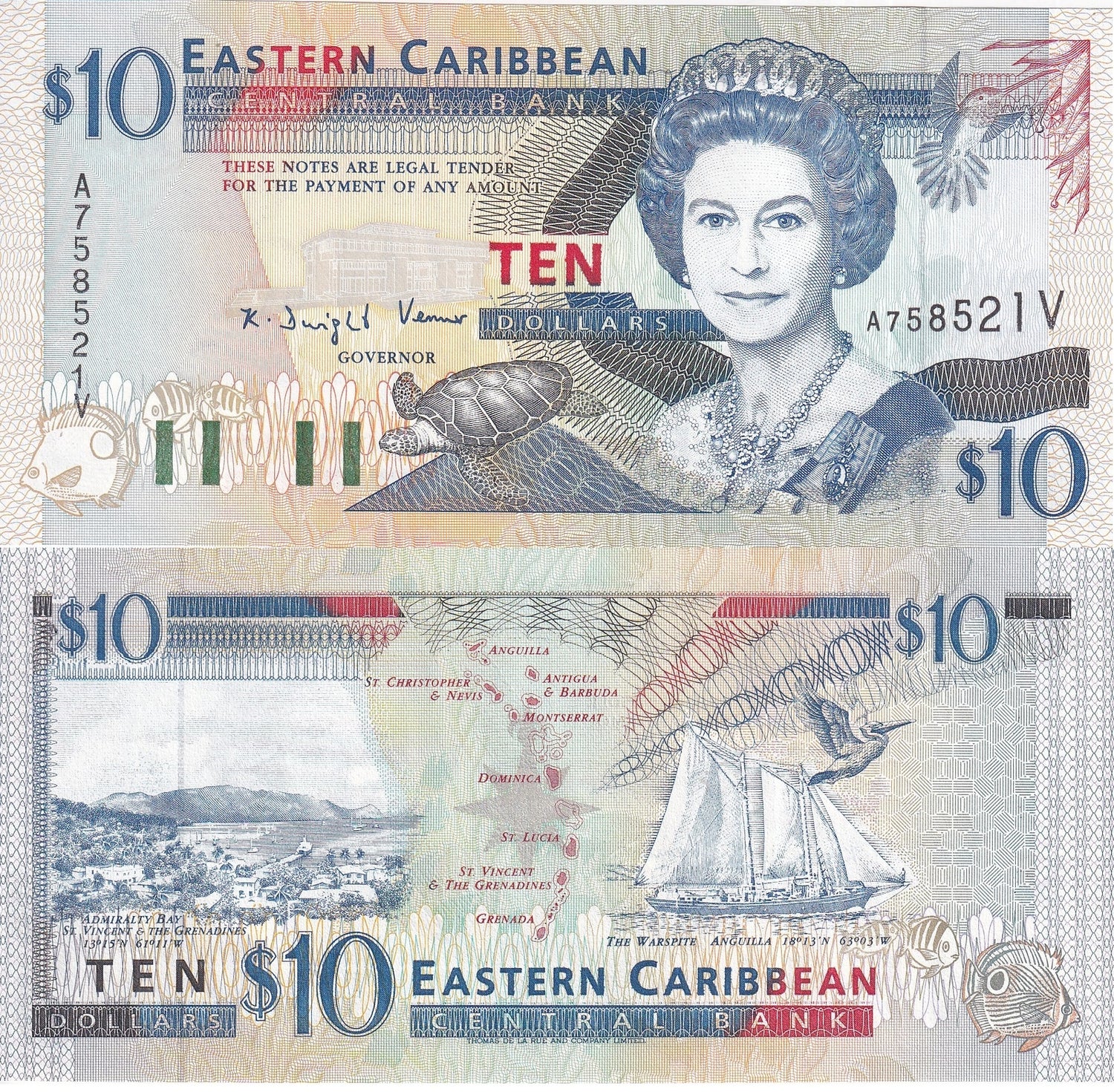 East Caribbean 10 Dollars ND 1994 P 32 v St. Vincent UNC