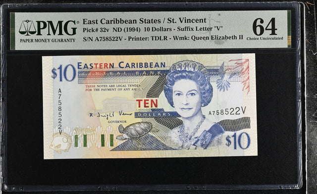 East Caribbean 10 Dollars ND 1994 P 32 v Suffix V St. Vincent Choice UNC PMG 64