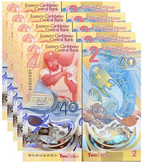 East Caribbean 2 Dollars 2023 2024 40th P 61 Polymer UNC LOT 5 Pcs