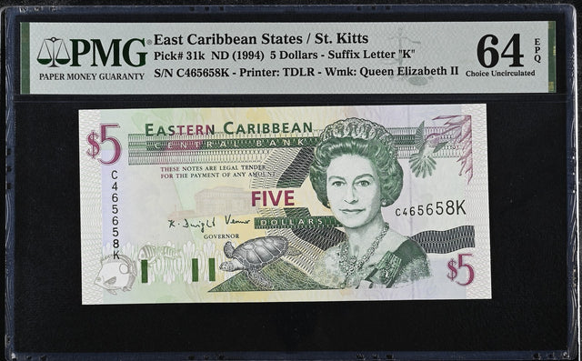 East Caribbean 5 Dollars ND 1994 P 31 k Choice UNC PMG 64 EPQ
