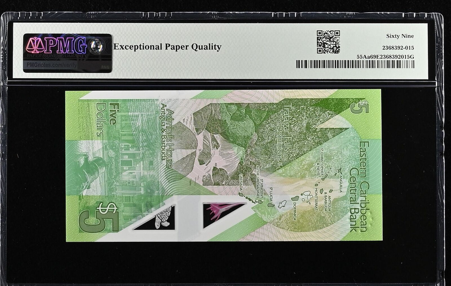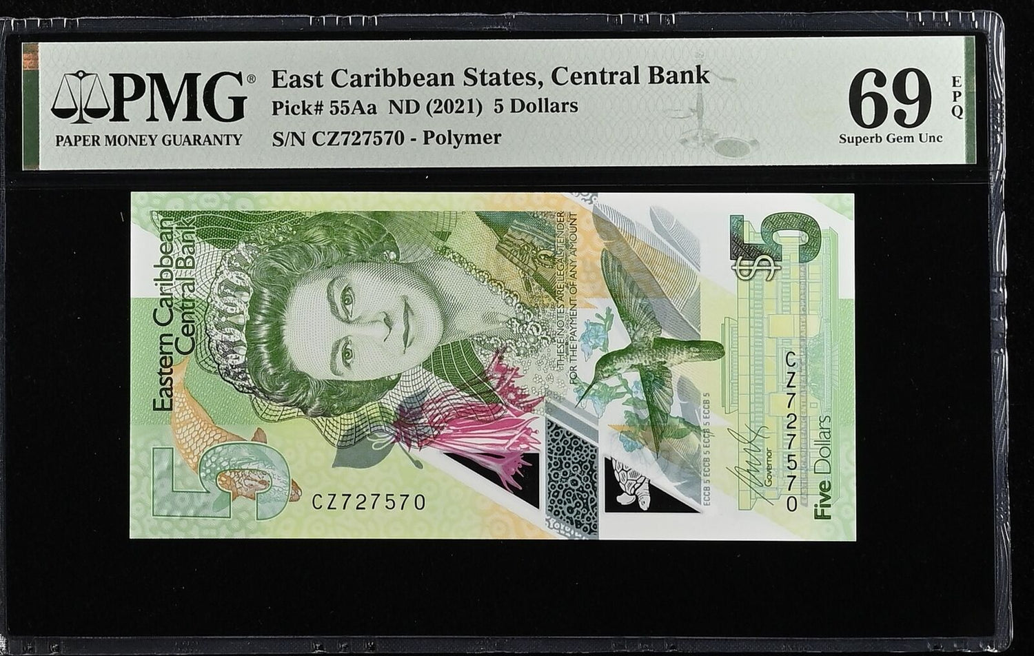 East Caribbean 5 Dollars ND 2021 P 55Aa Polymer Superb Gem UNC PMG 69 EPQ