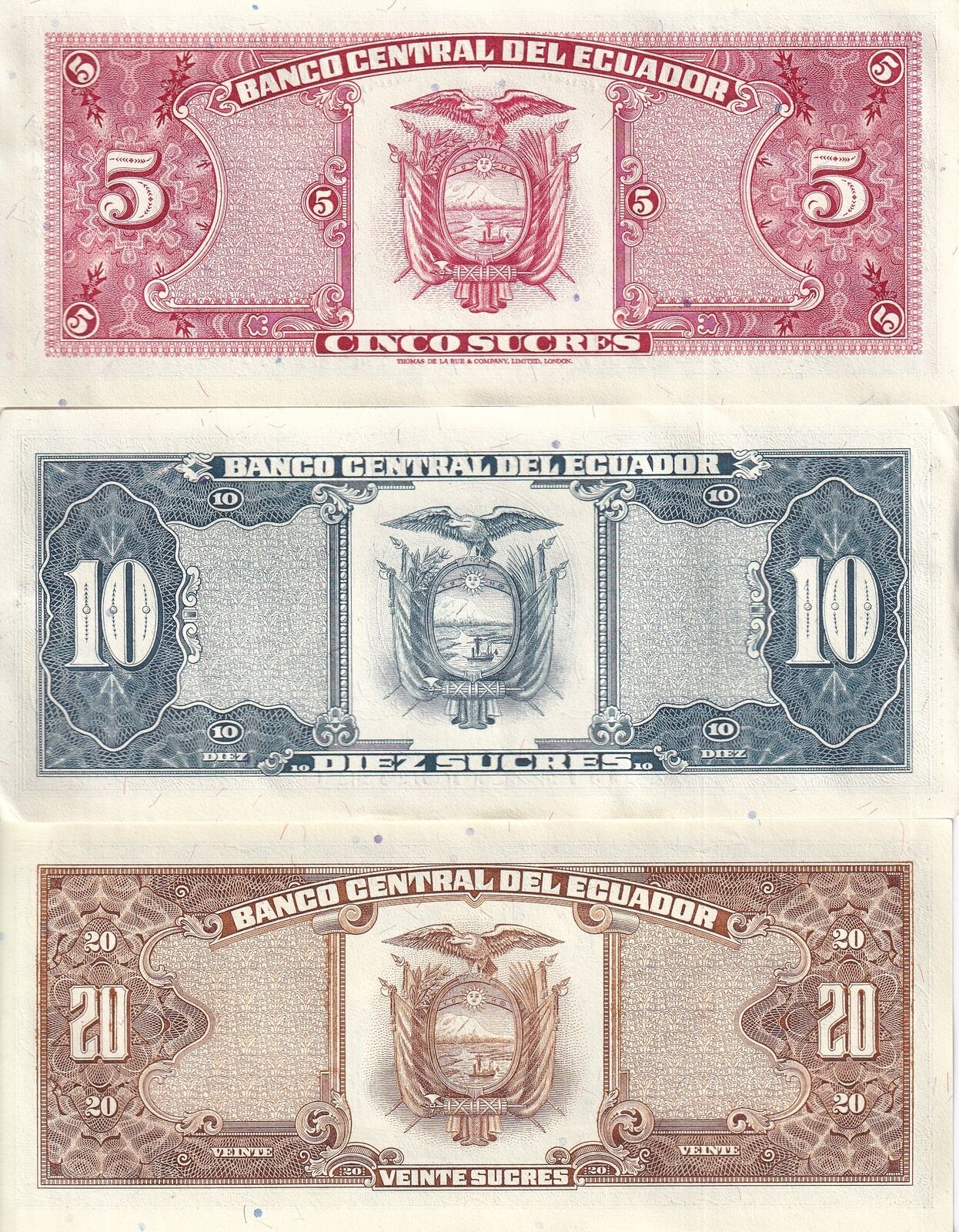 Ecuador Set 3 AU 5 10 20 Sucres 1988 P 113 121 121A AUnc