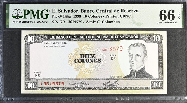 El Salvador 10 Colones 1996 P 144 a Gem UNC PMG 66 EPQ