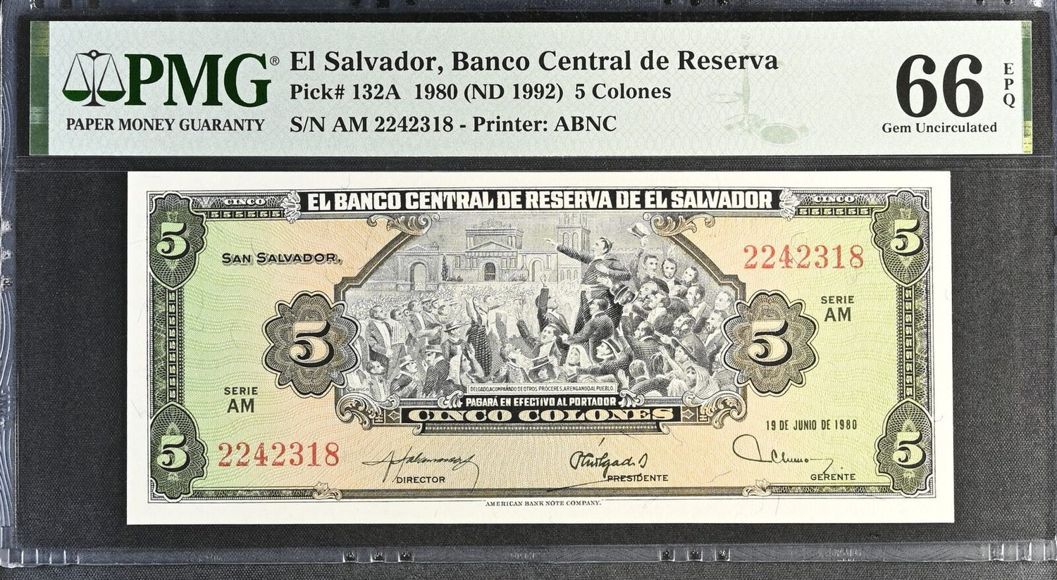 El Salvador 5 Colones 1980 ND 1992 P 132A Gem UNC PMG 66 EPQ