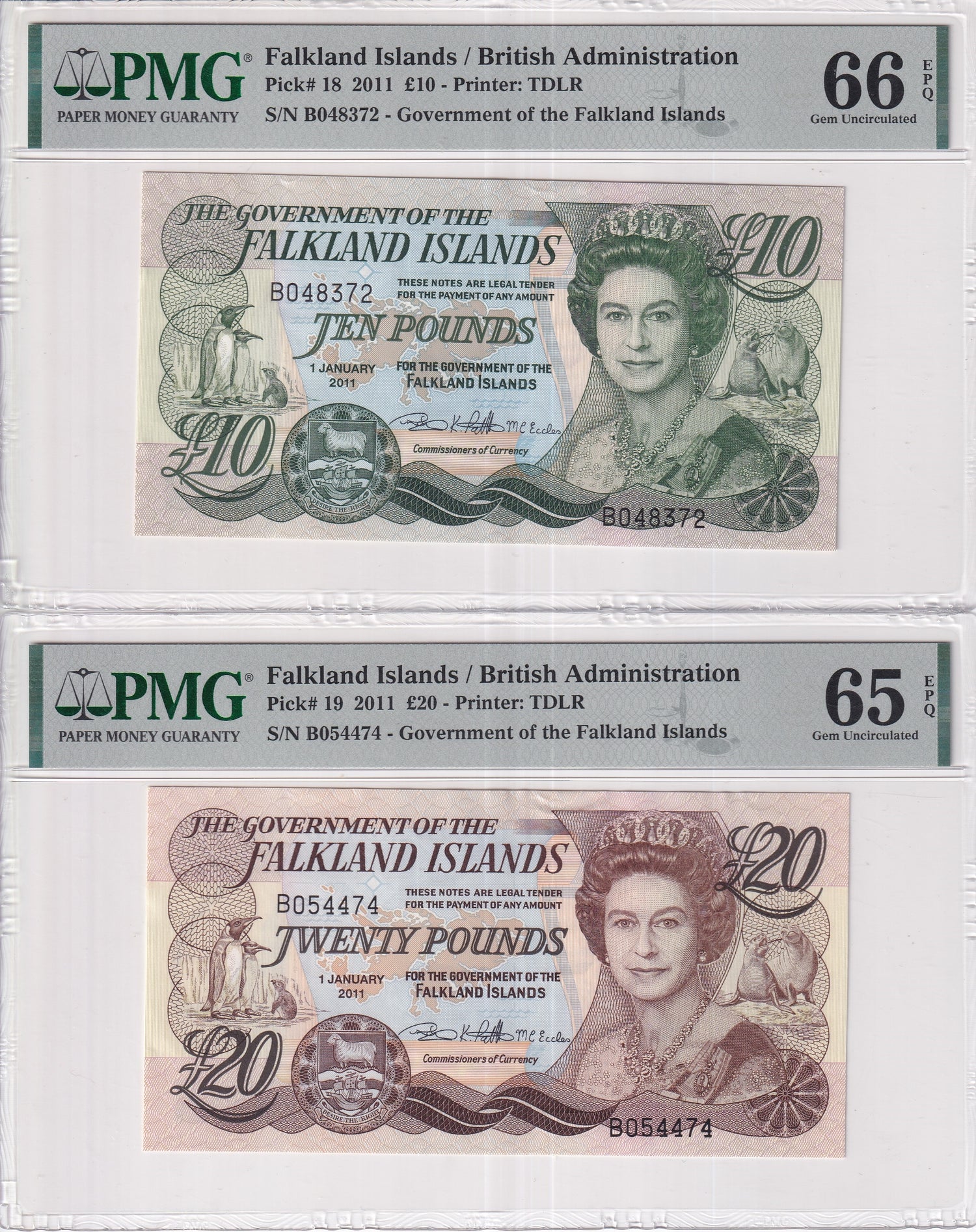 Falkland Islands Set 2: 10 20 Pounds 2011 P 18 P 19 Gem UNC PMG 65 66 EPQ