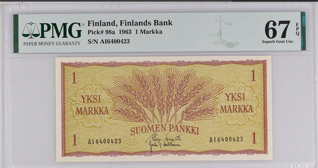 Finland 1 Markka 1963 P 98 a Superb GEM UNC PMG 67 EPQ HIGH