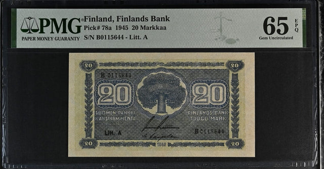 Finland 20 Markkaa 1945 P 78 Litt. A P 78 a Gem UNC PMG 65 EPQ