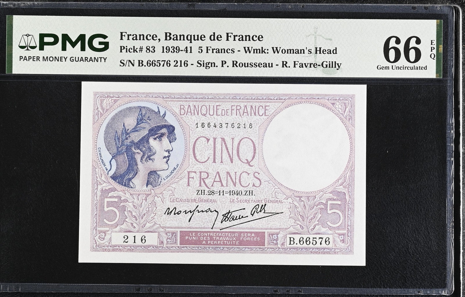 France 5 Francs 1940 P 83 Gem UNC PMG 66 EPQ