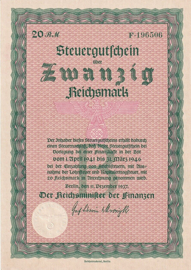 Germany 20 Reichsmark RM 1941-1946 Bond Zwanzig Big Size UNC