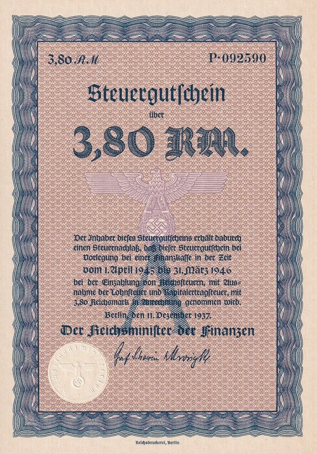 Germany 3.8 Reichsmark RM 1941-1946 Bond Steuergutfchein Big Size UNC