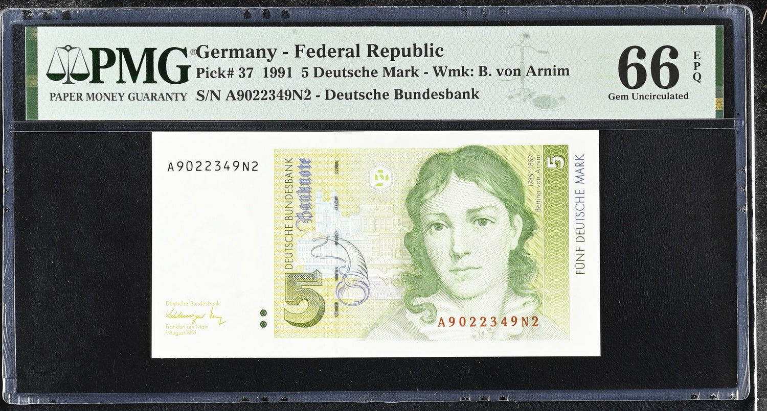 Germany 5 Deutsche Mark 1991 P 37 Gem UNC PMG 66 EPQ