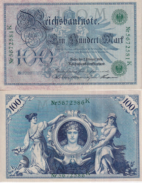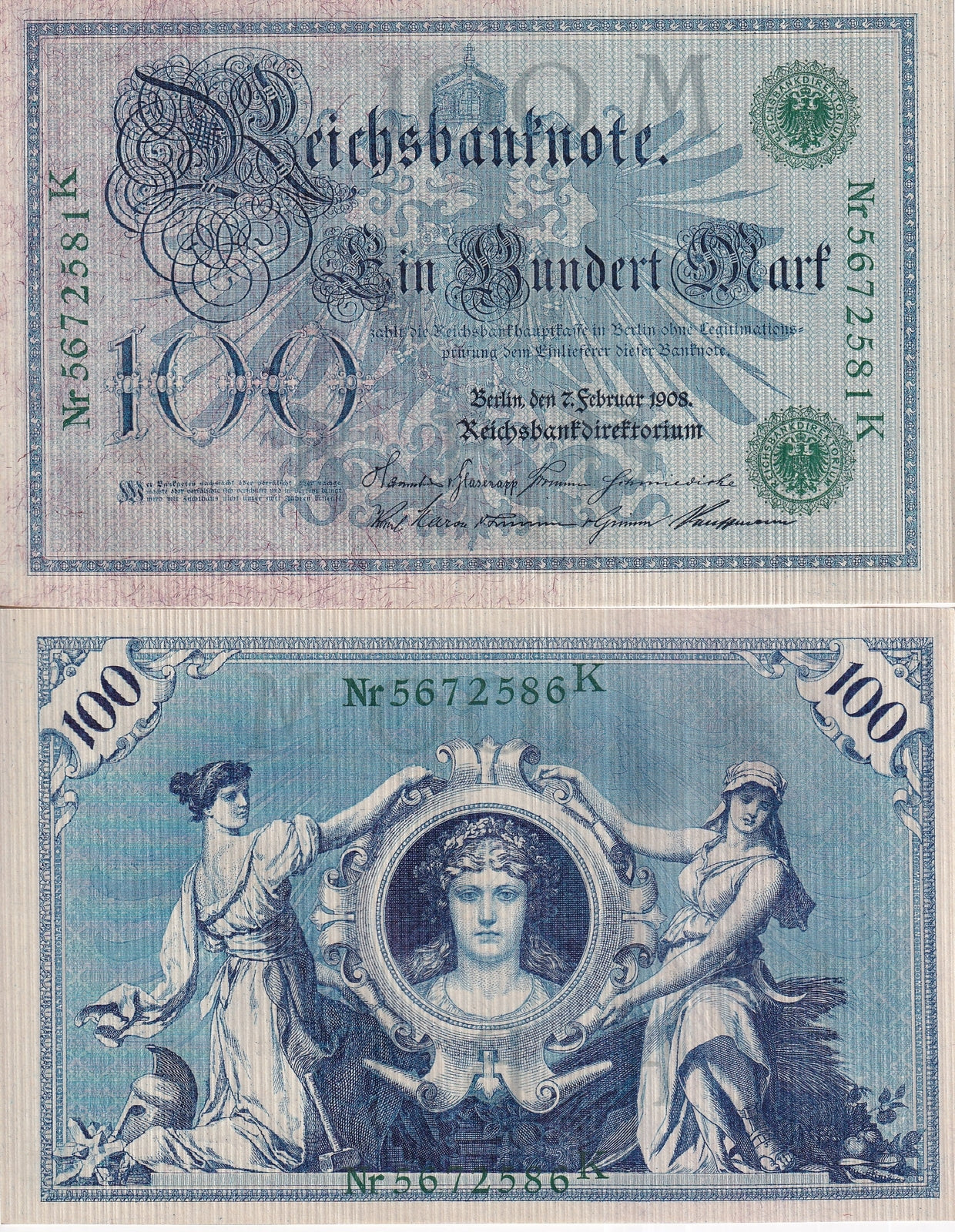 Germany Reichsbank 100 Mark 1908 Green S/N P 34 UNC