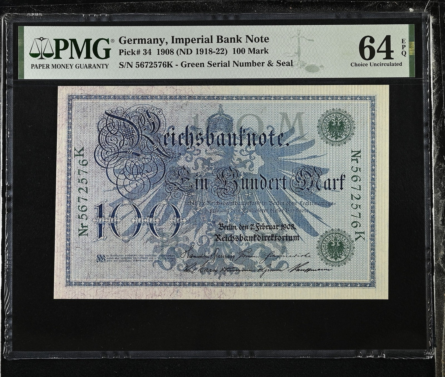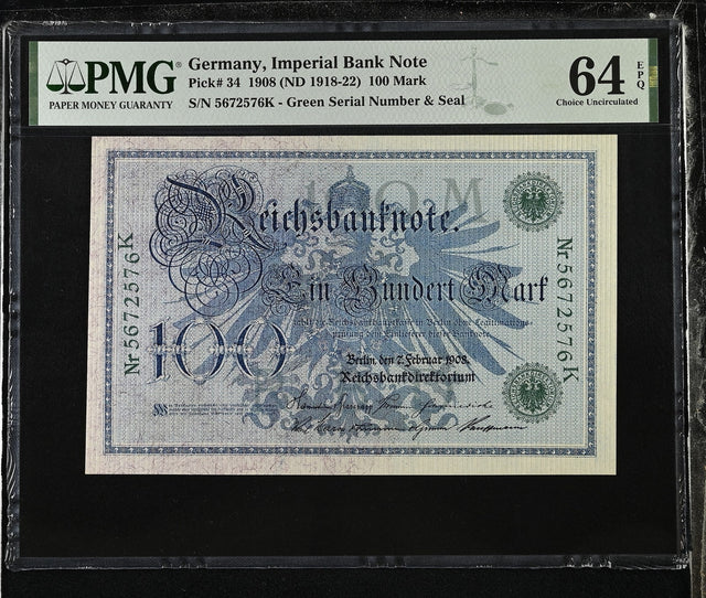 Germany Reichsbank 100 Mark 1908 ND 1918-1922 P 34 Choice UNC PMG 64 EPQ