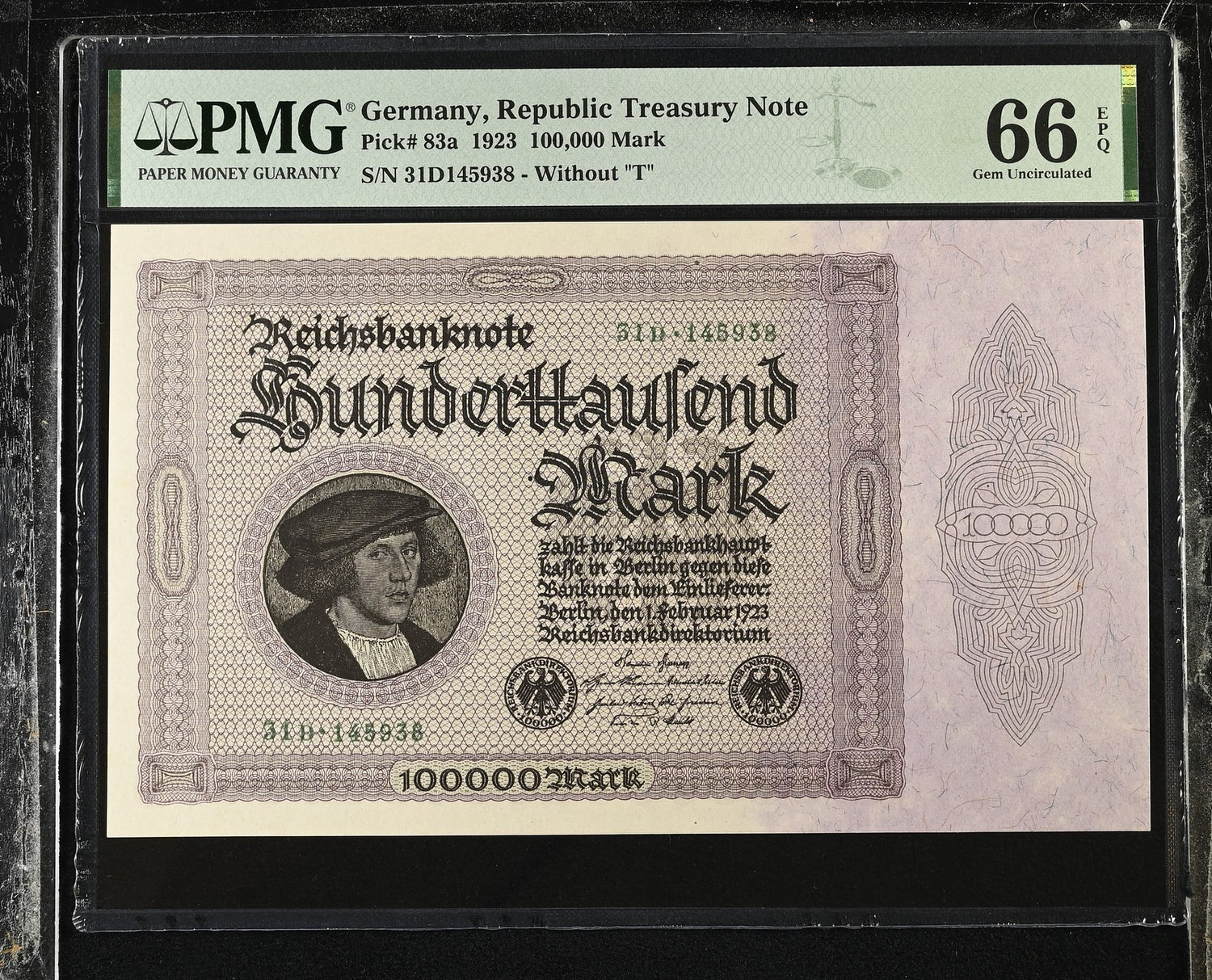 GERMANY Reichsbank 100000 Mark 1923 P 83 a Gem UNC PMG 66 EPQ
