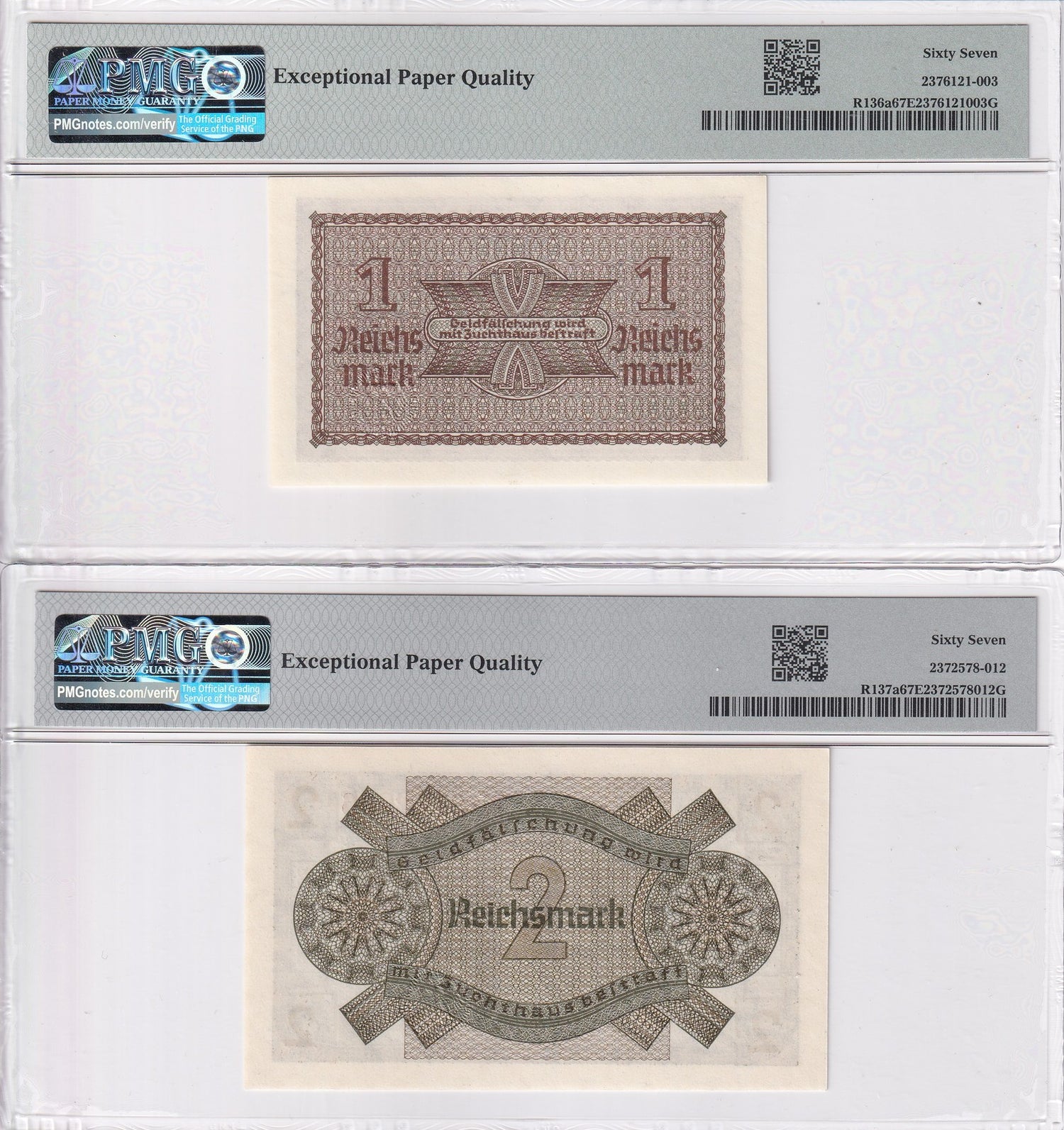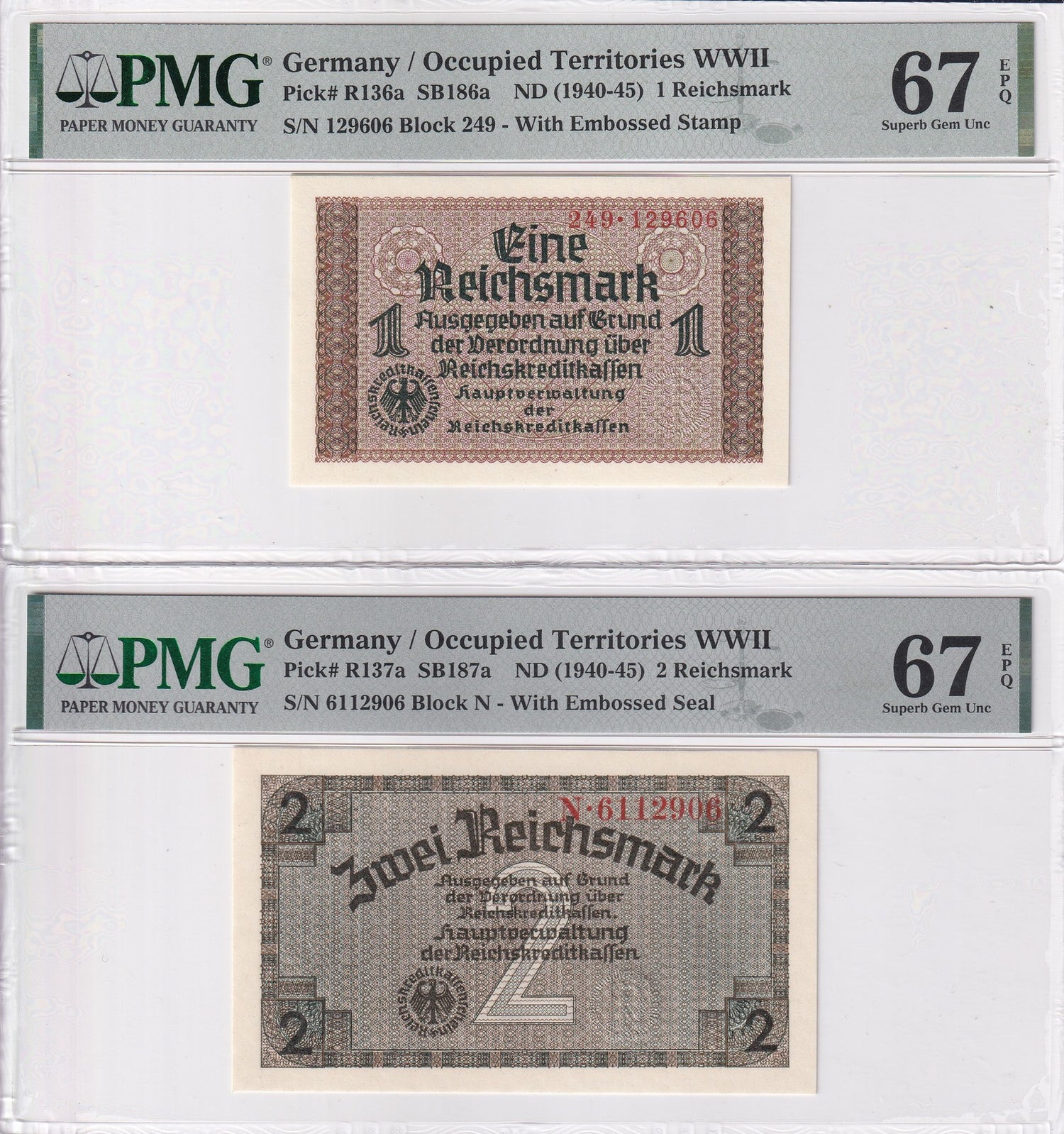 Germany SET 2; 1 2 Reichsmark ND 1940 P R136 P R137 Superb Gem UNC PMG 67 EPQ