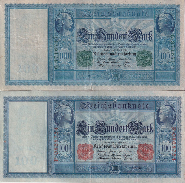 Germany SET 2 , 100 Mark 1910 Green + Red Seal P 42 43 Fine Used Circulated