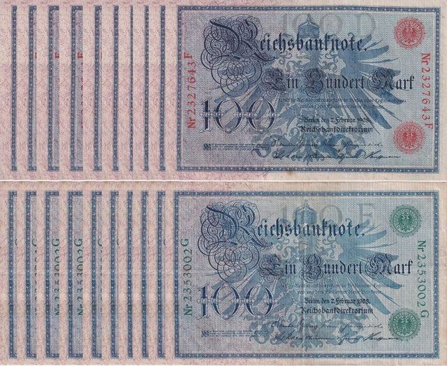 Germany SET 2 x LOT 5= 10 PCS 100 Mark 1908 Green+Red Seal P 33 34 FineCirculate