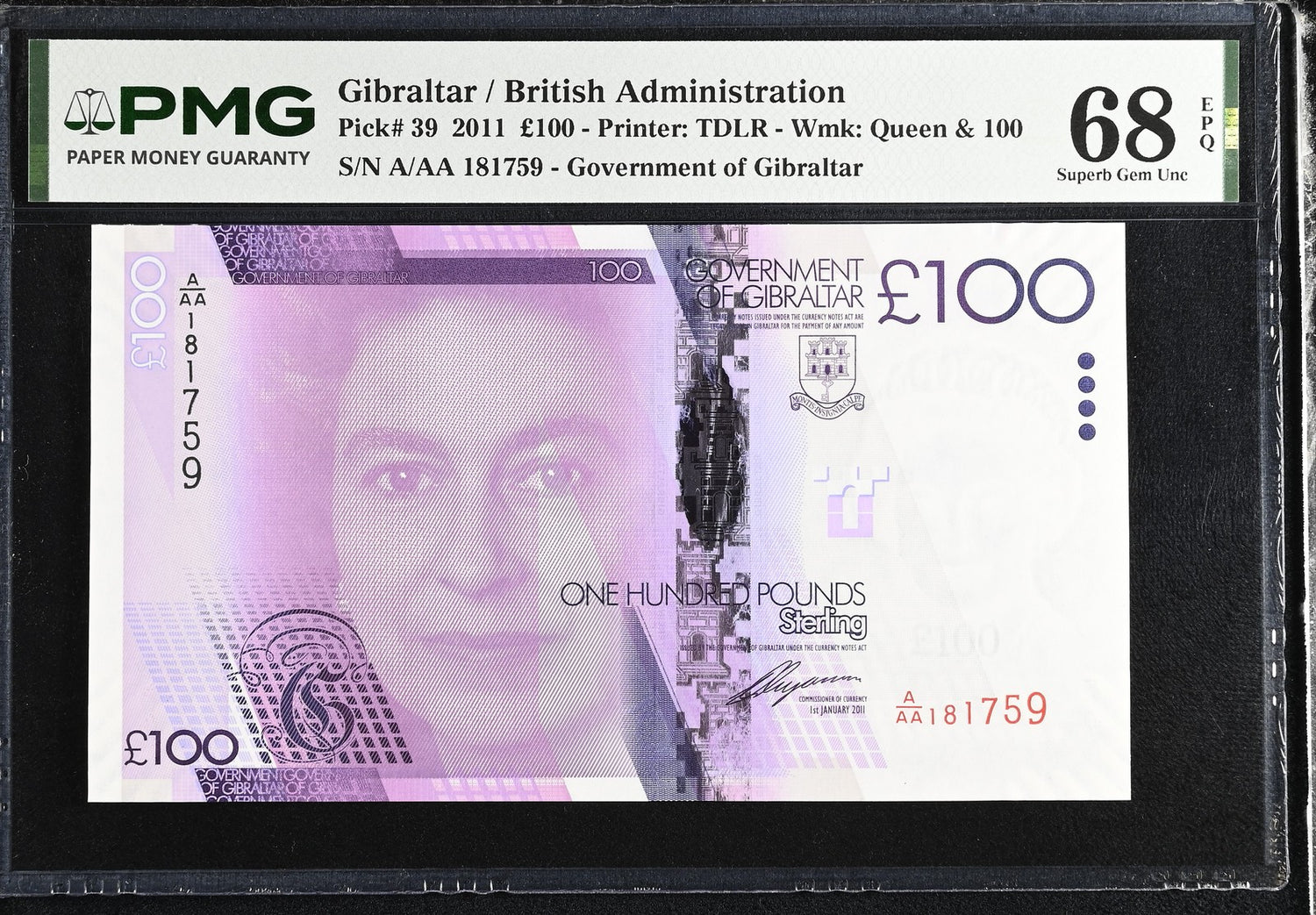 Gibraltar 100 Pounds 2011 P 39 Superb Gem UNC PMG 68 EPQ