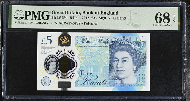 Great Britain 5 Pounds 2015 P 394 Polymer Superb Gem UNC PMG 68 EPQ PNB