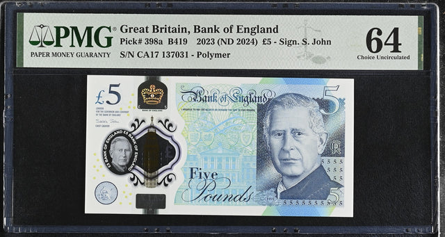 GREAT BRITAIN 5 Pounds 2023 ND 2024 P 398 a Polymer Choice UNC PMG 64