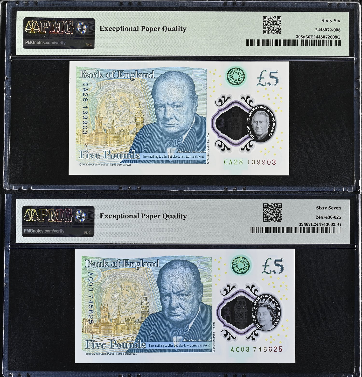 Great Britain Set 2; 5 Pounds 2015-2024 P 394 P 398 Superb Gem UNC PMG 66 67 EPQ
