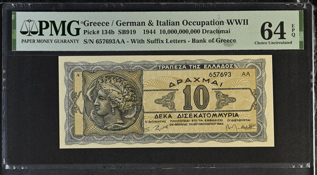Greece 10 Billion Drachmai 1944 P 134 b Choice UNC PMG 64 EPQ
