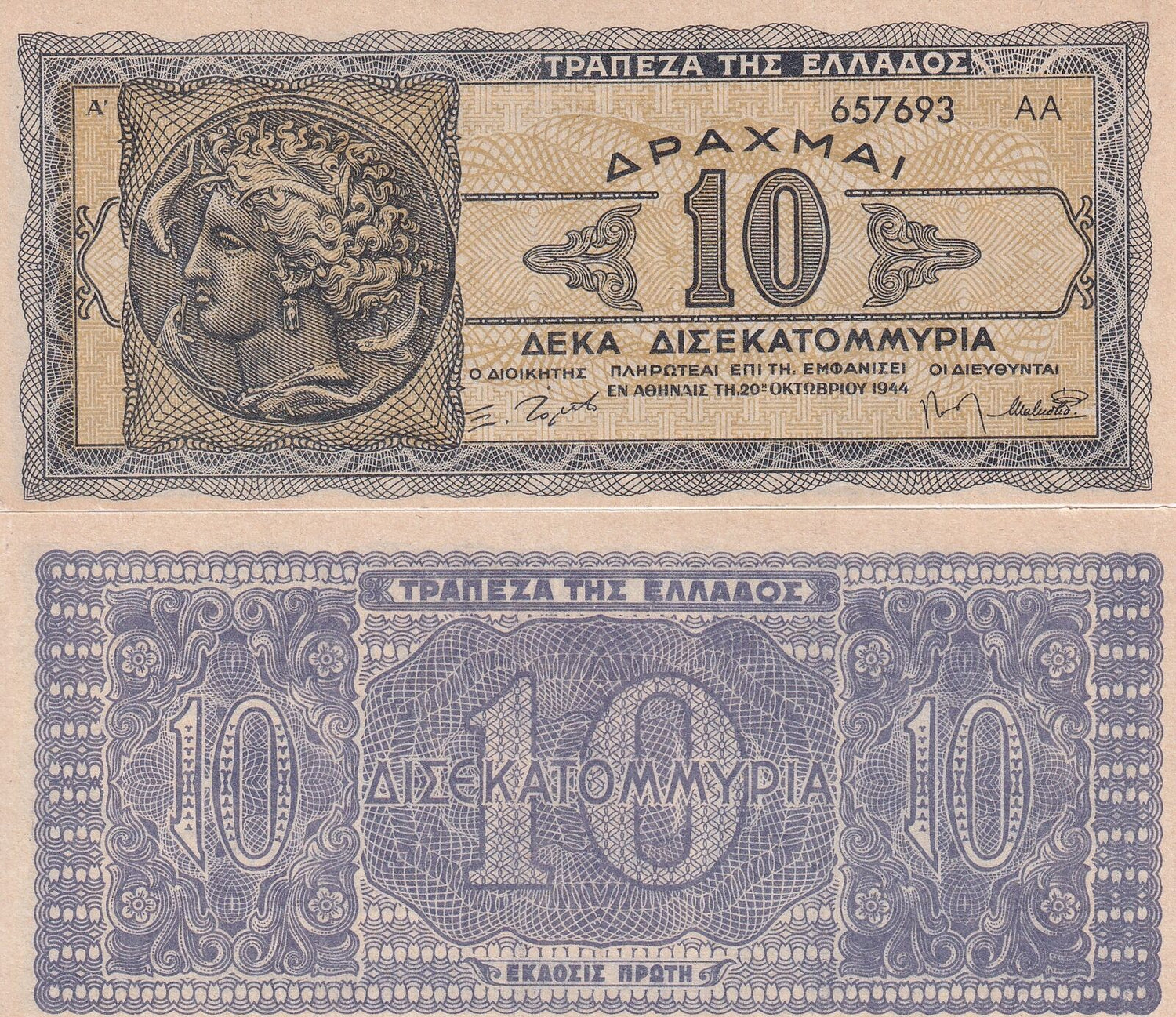 Greece 10 Billion Drachmai 1944 P 134 b UNC