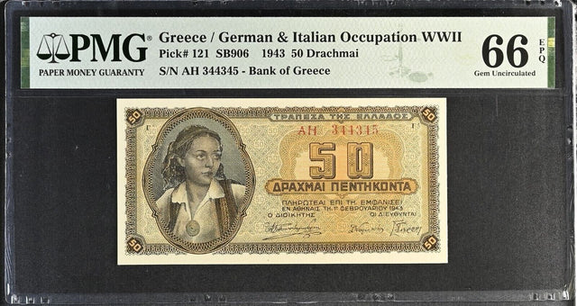 Greece 50 Drachmai 1943 P 121 Gem UNC PMG 66 EPQ