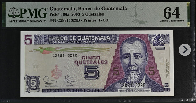 Guatemala 5 Quetzales 2003 P 106 a Choice UNC PMG 64