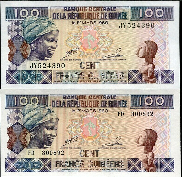 GUINEA SET 2 PCS OF 100 FRANCS 1998 2012 P 35 a b UNC