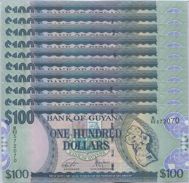 Guyana 100 Dollars 2022 P 36 e UNC Lot 10 PCS