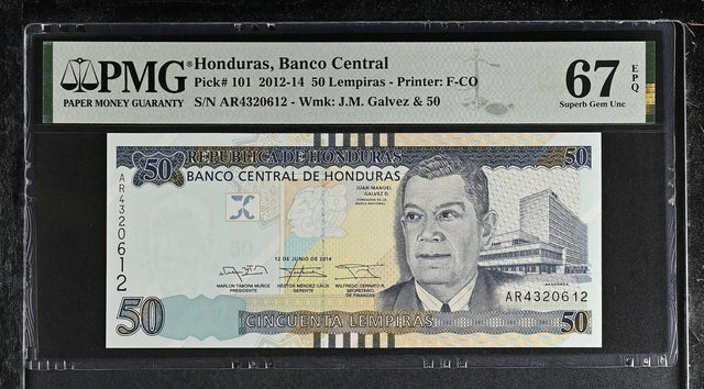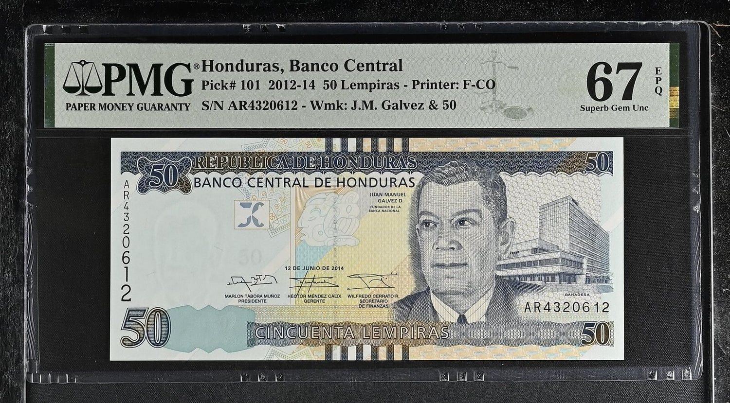 Honduras 50 Lempira 2014 P 101 Superb Gem UNC PMG 67 EPQ