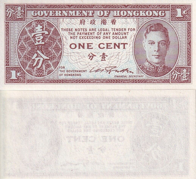 Hong Kong 1 Cent ND 1945 P 321 Uniface King VI UNC
