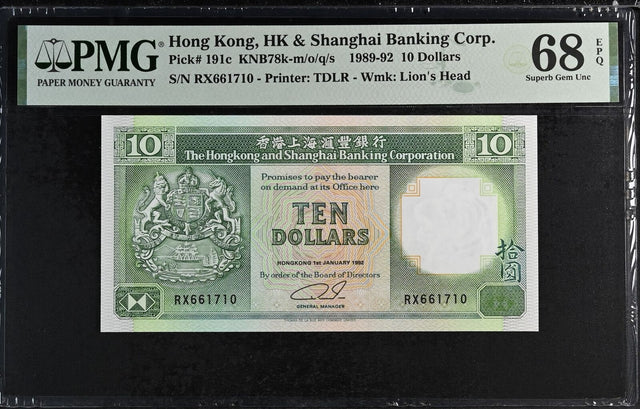Hong Kong 10 Dollars 1992 P 191 c Superb Gem UNC PMG 68 EPQ