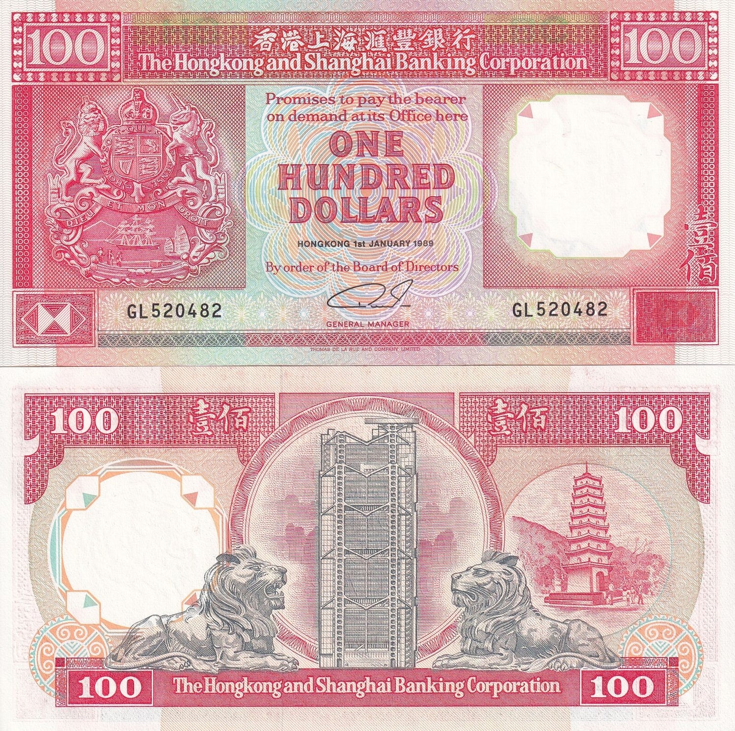 Hong Kong 100 Dollars 1989 P 198 a UNC