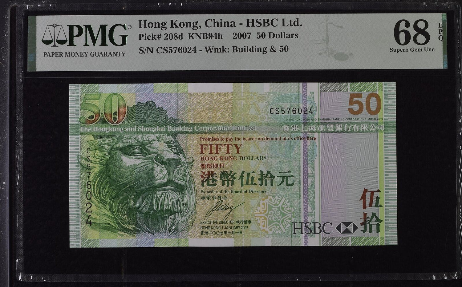 Hong Kong 50 Dollars 2007 P 208 d Superb Gem UNC PMG 68 EPQ