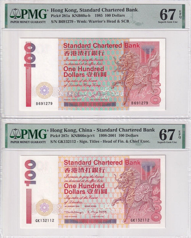 Hong Kong SET 2 , 100 Dollars 1985 2000 P 281 287 Superb Gem UNC PMG 67 EPQ