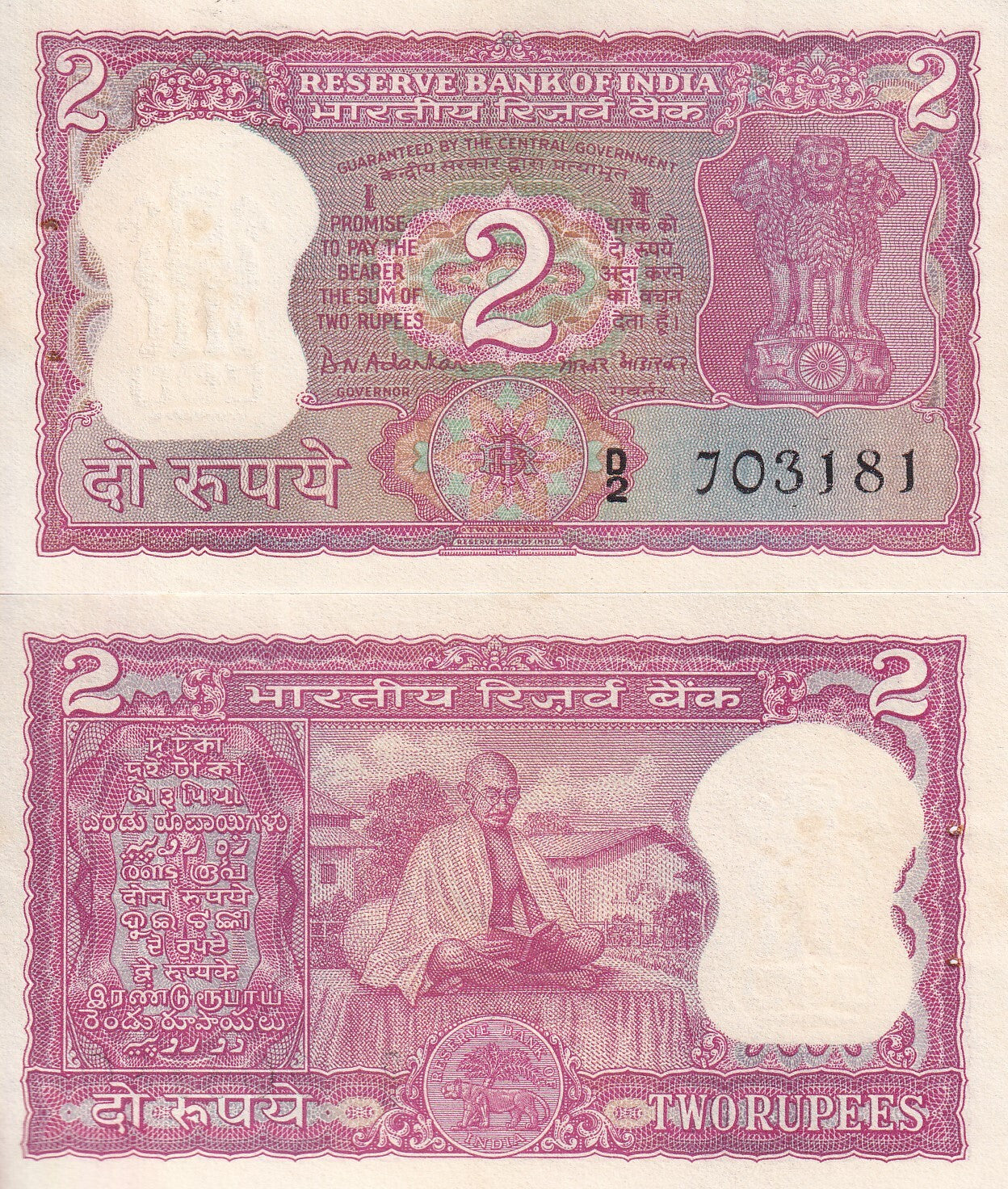 India 2 Rupees ND 1969-1970 P 67 b UNC With Issued Pin Hole