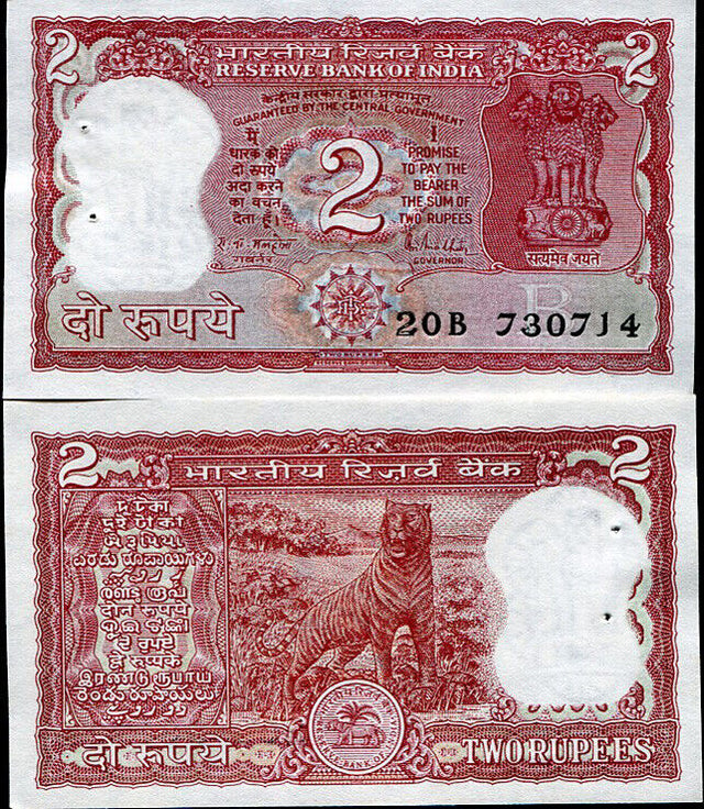 India 2 Rupees P 53 A/d UNC W/LITTLE TONE W/H