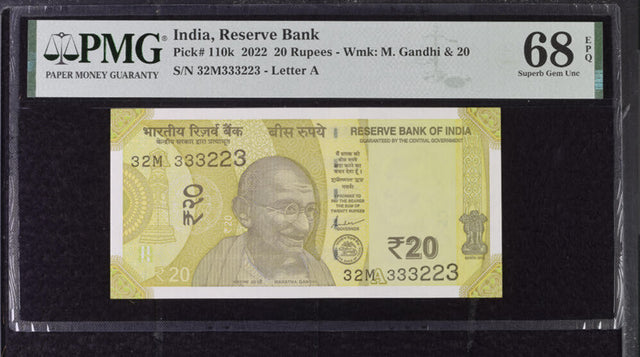 India 20 Rupees 2022 P 110 k NICE # 333223 Superb Gem UNC PMG 68 EPQ