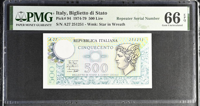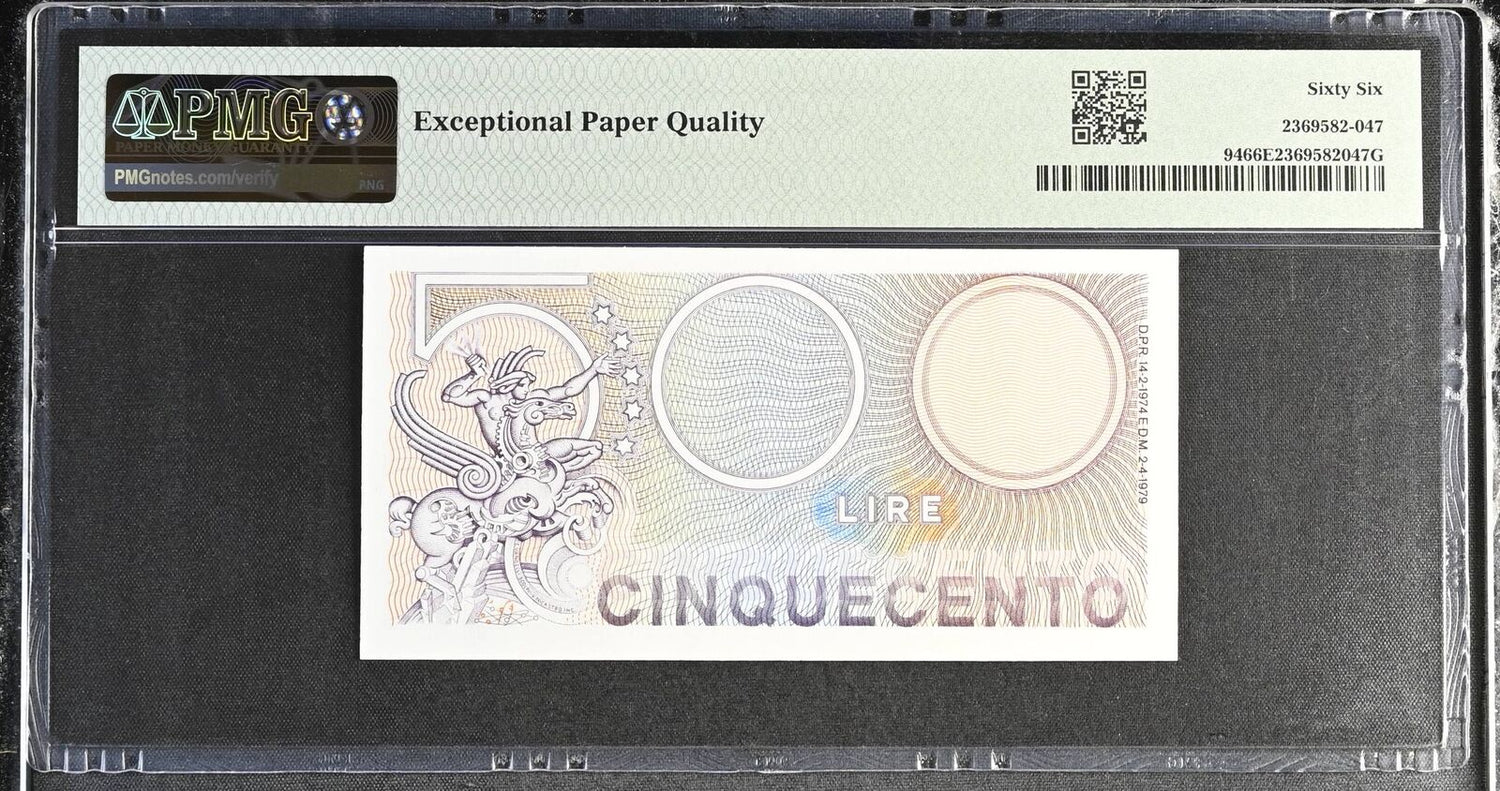 Italy 500 Lire 1974-1979 P 94 Repeater Gem UNC PMG 66 EPQ