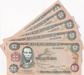 Jamaica 2 Dollars 1993 P 69 e UNC LOT 5 PCS